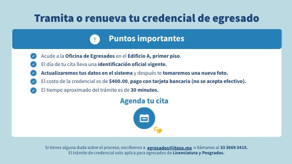 Si tienes alguna duda sobre el proceso, escríbenos a o llámanos al 33 3669 3415. El trámite de credencial solo aplica para egresados de Licenciatura y Posgrados.