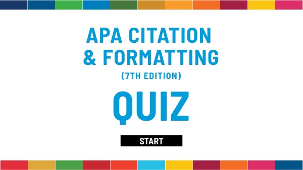 This quiz is about the correct usage of the American Psychological Association (APA) Citation Style (7th edition) for formatting a research project. Your task is to carefully read each question, select the best answer (or answers) before clicking "Send" to see the results. Then click "Next" to move to the next question. Need to brush up on APA before taking the quiz? Check out our LibGuide: https://libraryguides.salisbury.edu/citation