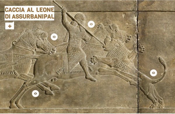 Le sculture mostrano diverse scene di una caccia organizzata all'interno di un'arena, nella quale il re Assurbanipal (regno 668-631 a.C.) massacra con frecce, lancia o spada dei leoni aizzati contro di lui dai servitori che assistono.