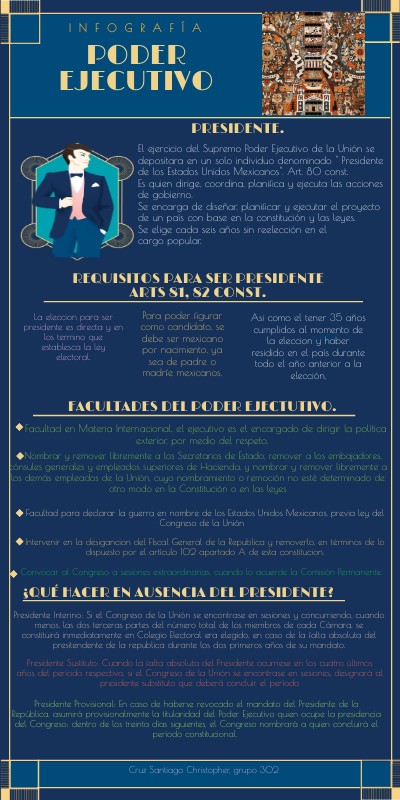 El ejercicio del Supremo Poder Ejecutivo de la Unión se depositara en un solo individuo denominado " Presidente de los Estados Unidos Mexicanos". Art. 80 const. Es quien dirige, coordina, planifica y ejecuta las acciones de gobierno. Se encarga de diseñar, planificar y ejecutar el proyecto de un país con base en la constitución y las leyes. Se elige cada seis años sin reelección en el cargo popular.
