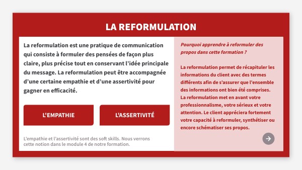 Pourquoi apprendre à reformuler des propos dans cette formation ?La reformulation permet de récapituler les informations du client avec des termes différents afin de s’assurer que l’ensemble des informations ont bien été comprises. La reformulation met en avant votre professionnalisme, votre sérieux et votre attention. Le client appréciera fortement votre capacité à reformuler, synthétiser ou encore schématiser ses propos.