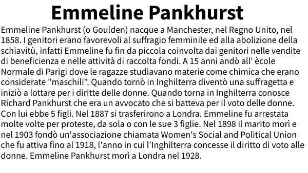 Emmeline Pankhurst (o Goulden) nacque a Manchester, nel Regno Unito, nel 1858. I genitori erano favorevoli al suffragio femminile ed alla abolizione della schiavitù, infatti Emmeline fu fin da piccola coinvolta dai genitori nelle vendite di beneficienza e nelle attività di raccolta fondi. A 15 anni andò all' ècole Normale di Parigi dove le ragazze studiavano materie come chimica che erano considerate "maschili". Quando tornò in Inghilterra diventò una suffragetta e iniziò a lottare per i diritte delle donne. Quando torna in Inghilterra conosce Richard Pankhurst che era un avvocato che si batteva per il voto delle donne. Con lui ebbe 5 figli. Nel 1887 si trasferirono a Londra. Emmeline fu arrestata molte volte per proteste, da sola o con le sue 3 figlie. Nel 1898 il marito morì e nel 1903 fondò un'associazione chiamata Women's Social and Political Union che fu attiva fino al 1918, l'anno in cui l'Inghilterra concesse il diritto di voto alle donne. Emmeline Pankhurst morì a Londra nel 1928.