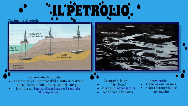 Giacimento di petrolio:- Sta sotto rocce impermeabili e sotto uno strato di roccia imbevuta di idrocarburi e acqua