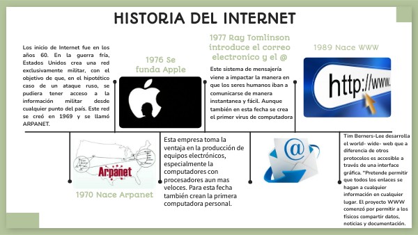 Los inicio de Internet fue en los años 60. En la guerra fría, Estados Unidos crea una red exclusivamente militar, con el objetivo de que, en el hipotético caso de un ataque ruso, se pudiera tener acceso a la información militar desde cualquier punto del país. Este red se creó en 1969 y se llamó ARPANET.