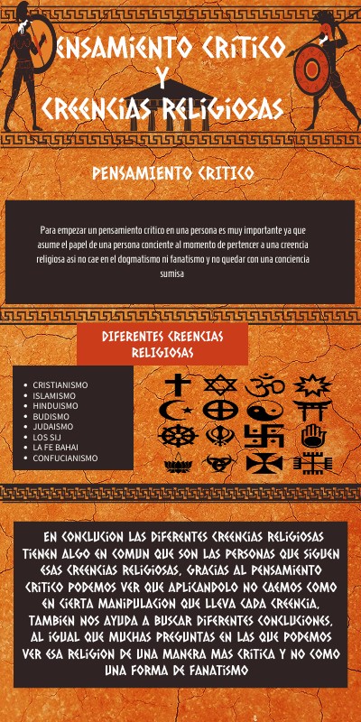 En conclucion las diferentes creencias religiosas tienen algo en comun que son las personas que siguen esas creencias religiosas, gracias al pensamiento critico podemos ver que aplicandolo no caemos como en cierta manipulacion que lleva cada creencia, tambien nos ayuda a buscar diferentes concluciones, al igual que muchas preguntas en las que podemos ver esa religion de una manera mas critica y no como una forma de fanatismo