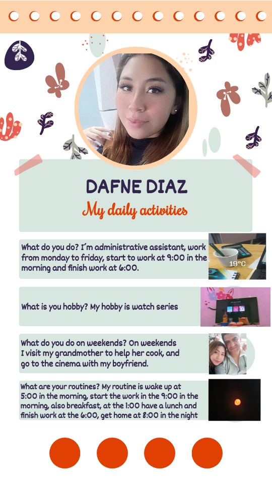 What do you do? I´m administrative assistant, work from monday to friday, start to work at 9:00 in the morning and finish work at 6:00.