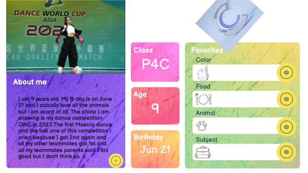 I am 9 years old. My B-day is on June 21 and I actcally love all the animals but i am scard of all. The photo I am showing is my dance competition DWC in 2023.The first Mascra dance and the last one of this competition i cried because I got 2nd again and all my other teammates got 1st and all my teammates parents said I did good but I don't think so. :c