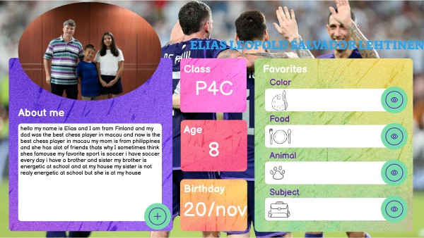 hello my name is Elias and I am from Finland and my dad was the best chess player in macau and now is the best chess player in macau my mom is from philippines and she has alot of friends thats why I sometimes think shes famouse my favorite sport is soccer i have soccer every day i have a brother and sister my brother is energetic at school and at my house my sister is not realy energetic at school but she is at my house