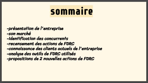 -présentation de l'entreprise -son marché -identification des concurrents -recensement des actions de FDRC -connaissance des clients actuels de l'entreprise -analyse des outils de FDRC utilisés -propositions de 2 nouvelles actions de FDRC