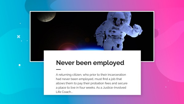 A returning citizen, who prior to their incarceration had never been employed, must find a job that allows them to pay their probation fees and secure a place to live in four weeks. As a Justice-Involved Life Coach...