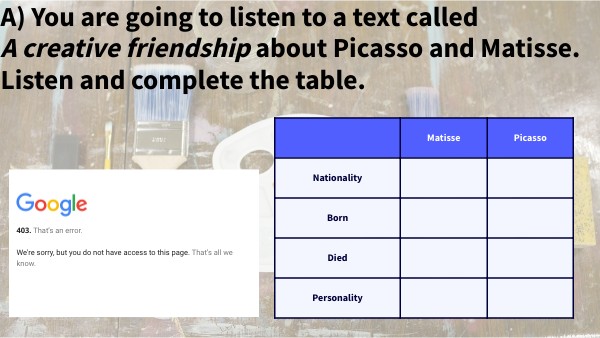 A) You are going to listen to a text called A creative friendship about Picasso and Matisse. Listen and complete the table.
