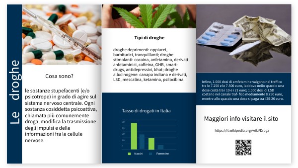droghe deprimenti: oppiacei, barbiturici, tranquillanti; droghe stimolanti: cocaina, anfetamina, derivati anfetaminici, caffeina, GHB, smart-drugs, antidepressivi, khat; droghe allucinogene: canapa indiana e derivati, LSD, mescalina, ketamina, psilocibina.