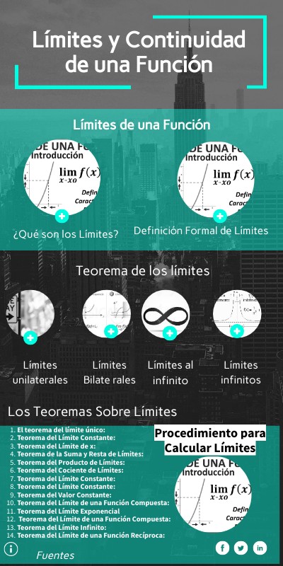 1.El teorema del límite único establece que si el límite de una función existe, entonces ese límite es único, es decir, no puede tener más de un valor. En términos matemáticos, si para una función f(x), el límite cuando x se acerca a un valor "a" existe, esto significa que no importa cómo te acerques a "a" (desde la izquierda o desde la derecha), el límite será el mismo número. 2. Teorema del Límite Constante: Este teorema establece que el límite de una constante es simplemente esa constante. En otras palabras, si tienes una función f(x) = c, donde "c" es una constante, entonces el límite de f(x) cuando x se acerca a cualquier valor "a" es igual a "c." 3. Teorema del Límite de x," establece que: Lim[x -> a] x = a Este teorema es fundamental y esencial en el cálculo. Significa que el límite de la variable independiente "x" cuando x se acerca al valor "a" es igual a "a". En otras palabras, a medida que te acercas a un número específico "a," la variable "x" se acercará a ese mismo número "a."3. 4. Teorema de la Suma y Resta de Límites: Este teorema establece que el límite de la suma o resta de dos funciones es igual a la suma o resta de los límites de esas funciones individuales. En otras palabras, Lim[x -> a] (f(x) + g(x)) = Lim[x -> a] f(x) + Lim[x -> a] g(x) y lo mismo para la resta . 5. Teorema del Producto de Límites: Este teorema establece que el límite del producto de dos funciones es igual al producto de los límites de esas funciones individuales. En otras palabras, Lim[x -> a] (f(x) * g(x)) = Lim[x -> a] f(x) * Lim[x -> a] g(x). 6. Teorema del Cociente de Límites: Este teorema establece que el límite del cociente de dos funciones es igual al cociente de los límites de esas funciones individuales, siempre que el límite del denominador no sea cero. En otras palabras, Lim[x -> a] (f(x) / g(x)) = Lim[x -> a] f(x) / Lim[x -> a] g(x), siempre que Lim[x -> a] g(x) ≠ 0. 7. Teorema del Límite Constante y se expresa de la siguiente manera: Lim[x -> a] c * f(x) = c * Lim[x -> a] f(x) Este teorema establece que si tienes una constante "c" multiplicada por una función "f(x)" y calculas el límite cuando "x" se acerca a un valor "a," puedes llevar la constante fuera del límite. En otras palabras, el límite de la constante multiplicada por una función es igual a la constante multiplicada por el límite de la función original. 8. Teorema del Límite Constante. El teorema establece lo siguiente: Si c es una constante y Lim[x -> a] f(x) = L, entonces Lim[x -> a] [f(x)]^n = L^n. Este teorema se basa en la propiedad de que una constante elevada a una potencia "n" es igual al resultado de elevar la constante "c" a la potencia "n". En otras palabras, puedes llevar la constante "c" al límite de la función elevada a la potencia "n." 9. Teorema del Valor Constante o el Teorema del Valor del Límite. Establece que: Si una función p(x) es constante en un intervalo abierto que contiene el valor "a," entonces el límite de p(x) cuando x se acerca a "a" es igual al valor de p(a). 10. Teorema del Valor Constante. Si el límite de una función f(x) cuando x se acerca a un valor "a" es igual a un número "L" que es mayor o igual a cero (L >= 0), entonces el límite de la raíz cuadrada de f(x) es igual a la raíz cuadrada de "L." En otras palabras: Si Lim[x -> a] f(x) = L (L >= 0), entonces Lim[x -> a] √f(x) = √L. 11. Teorema del Límite Exponencial. Si el límite de una función f(x) cuando x se acerca a un valor "a" es igual a un número "L" y "n" es una constante positiva, entonces el límite de n^(√f(x)) es igual a n^(√L). 12. Teorema del Límite de una Función Compuesta: Este teorema establece que el límite de una función compuesta es igual a la función compuesta de los límites de las funciones individuales. Es decir, Lim[x -> a] (f(g(x))) = f(Lim[x -> a] g(x)). 13. Teorema del Límite Infinito: Este teorema establece que si el límite de una función es infinito, entonces la función se vuelve infinitamente grande a medida que x se acerca a "a." 14. Teorema del Límite de una Función Recíproca: Este teorema establece que el límite de la función recíproca es igual al recíproco del límite de la función original. En otras palabras, Lim[x -> a] (1/f(x)) = 1 / Lim[x -> a] f(x), siempre que Lim[x -> a] f(x) ≠ 0.