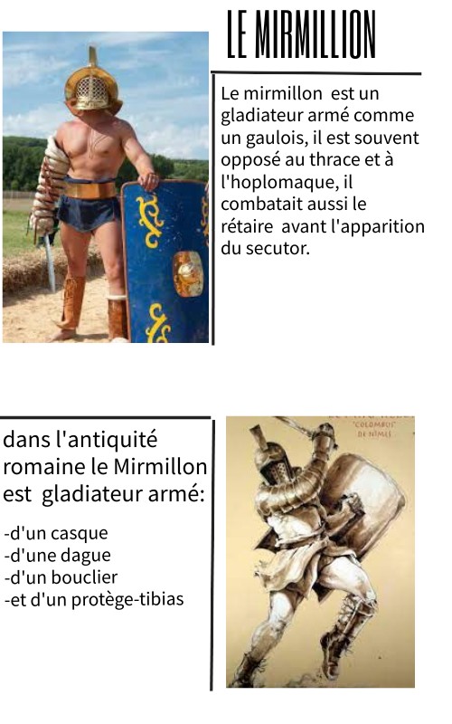 Le mirmillon est un gladiateur armé comme un gaulois, il est souvent opposé au thrace et à l'hoplomaque, il combatait aussi le rétaire avant l'apparition du secutor.