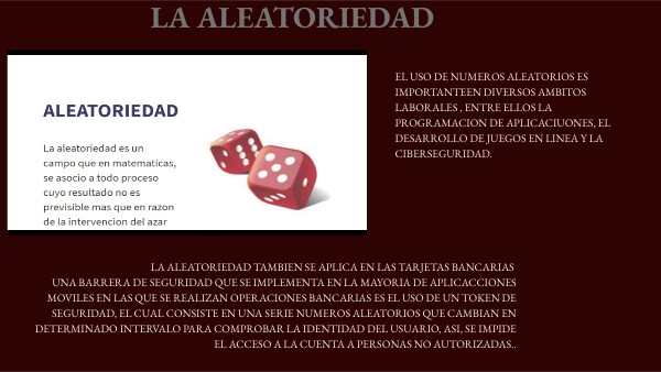 EL USO DE NUMEROS ALEATORIOS ES IMPORTANTEEN DIVERSOS AMBITOS LABORALES , ENTRE ELLOS LA PROGRAMACION DE APLICACIUONES, EL DESARROLLO DE JUEGOS EN LINEA Y LA CIBERSEGURIDAD.