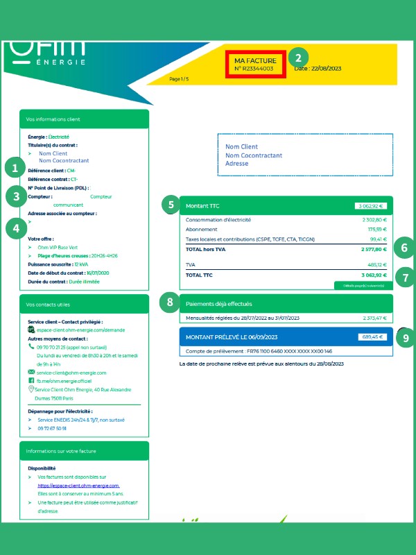Identifier la nature de la facture : (attention, non visible sur la facture, en tout cas pas à première vue (regarder la période de conso…) i. Facturation Mensuelle (facturation de la consommation réelle chaque mois, uniquement possible pour les compteurs communicants). ii. Facturation Bimestrielle (Tous les 2 mois, très rare, toujours sur la base des consommations réelles iii. Facturation annuelle (facturation dite de régule où l’on compare ce qui a été consommé avec la prévision ce qui conduit à un remboursement ou un nouveau prélèvement). On dit aussi que le client est mensualisé car il paie chaque mois le même montant (que l’on appelle une mensualité, à ne pas confondre avec un mode de paiement mensuelle). Le prélèvement est programmé par défaut le 5 de chaque mois) iv. Facture dite de service GRD (certaines prestations comme la mise en service urgente ou express sont facturées par le GRD. Ohm Energie refacture au client, et reverse l’argent au GRD) v. Facture dite de Billshock (uniquement pour les clients en mode de facturation annuelle. Cette facture est éditée au 5ème mois et/ou au 9ème mois, pour les clients ayant opté pour la facturation annuelle lorsque l’on constate que la consommation du client est plus importante que l’estimation initiale, appelée aussi CAR (pour consommation Annuelle de Référence). Parfois ce Billshock intervient en lien avec des augmentations tarifaires, mais ce n’est plus très courant). Le client est informé en amont de cette nouvelle facture. De plus, un ajustement de la mensualité est également appliqué pour que les nouvelles mensualités couvrent la consommation du client Déterminer la nature de la facture permet de comprendre la situation du client et de commencer les vérifications d’usage pour apporter les réponses attendues.