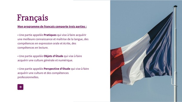 Mon programme de français comporte trois parties :• Une partie appelée Pratiques qui vise à faire acquérir une meilleure connaissance et maîtrise de la langue, des compétences en expression orale et écrite, des compétences en lecture. • Une partie appelée Objets d'étude qui vise à faire acquérir une culture générale et numérique. • Une partie appelée Perspective d'étude qui vise à faire acquérir une culture et des compétences professionnelles.
