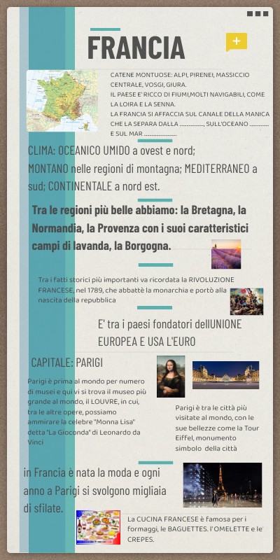 Tra le regioni più belle abbiamo: la Bretagna, la Normandia, la Provenza con i suoi caratteristici campi di lavanda, la Borgogna.