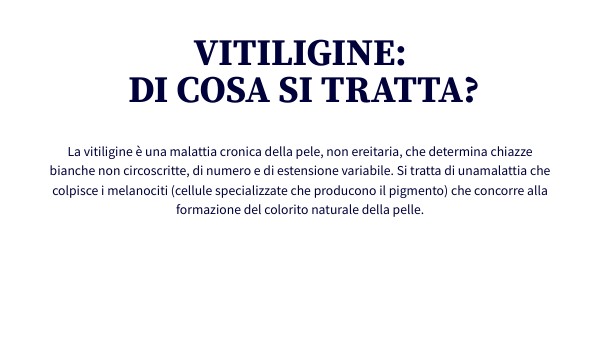 La vitiligine è una malattia cronica della pelle, non ereditaria, che determina chiazze bianche non circoscritte, di numero e di estensione variabile. Si tratta di una malattia che colpisce i melanociti (cellule specializzate che producono il pigmento) che concorre alla formazione del colorito naturale della pelle.