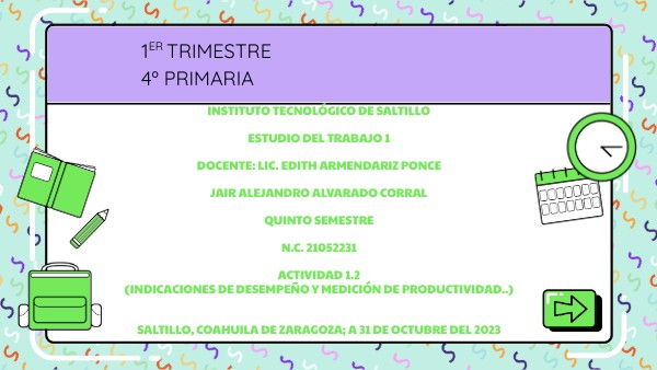 Instituto tecnológico de saltillo Estudio del trabajo 1 Docente: Lic. Edith Armendariz Ponce Jair Alejandro Alvarado Corral Quinto semestre N.C. 21052231 Actividad 1.2 (Indicaciones de Desempeño y medición de productividad..) Saltillo, Coahuila de zaragoza; a 31 de octubre del 2023