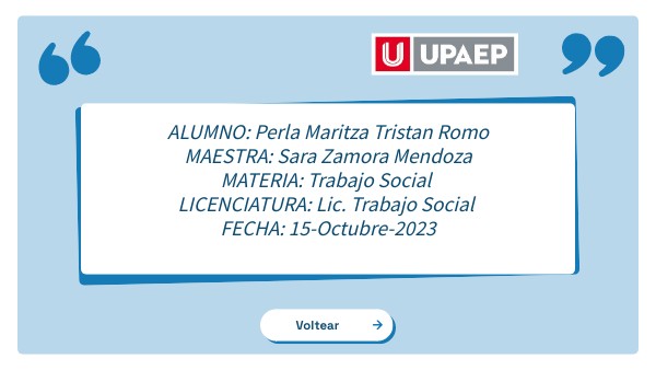 ALUMNO: Perla Maritza Tristan Romo MAESTRA: Sara Zamora Mendoza MATERIA: Trabajo Social LICENCIATURA: Lic. Trabajo Social FECHA: 15-Octubre-2023