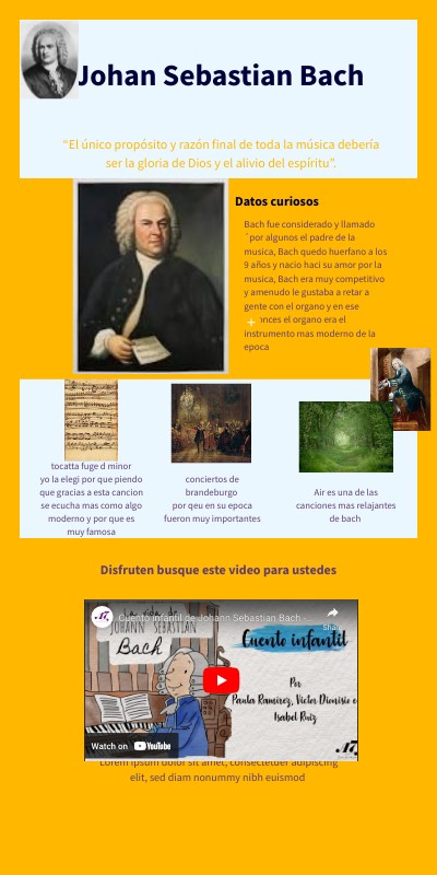 Bach fue considerado y llamado ´por algunos el padre de la musica, Bach quedo huerfano a los 9 años y nacio haci su amor por la musica, Bach era muy competitivo y amenudo le gustaba a retar a gente con el organo y en ese entonces el organo era el instrumento mas moderno de la epoca
