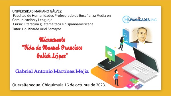 Manuel Francisco Galich López fue un hombre de talla continental, que se expresó mediante sus muy diversas facetas a partir de su vasta cultura, su verticalidad revolucionaria y su inteligencia sagaz: político, pensador, historiador, dramaturgo, ensayista, pedagogo, periodista, intelectual, crítico teatral, escritor, diplomático, editor, investigador y orador. Una historia muy corta. La idea es escribir una historia completa, que contenga todos los elementos de un cuento tradicional: ambiente, uno o varios personajes, conflicto, resolución, entre otros, todo en su diversidad de palabras. Este micro cuento se enfoca en la vida de este gran personaje guatemalteco que aportó significativamente a la literatura.