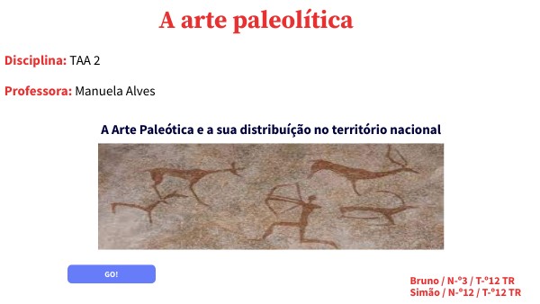 Neste trabalho, a pedido da professora Manuela Alves, na disciplina de TAA 2, nós vamos falar sobre a arte paleolítica e a sua distribuíção ao longo do território continental. Também vamos abordar temas, como as características e exemplos onde existe artes rupestres em Portugal, sendo qeu são raras e existe poucos lugares.