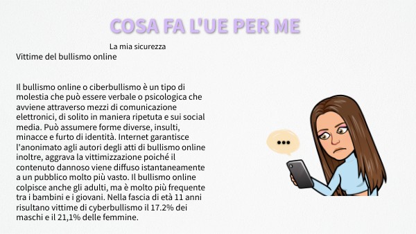 Vittime del bullismo online Il bullismo online o ciberbullismo è un tipo di molestia che può essere verbale o psicologica che avviene attraverso mezzi di comunicazione elettronici, di solito in maniera ripetuta e sui social media. Può assumere forme diverse, insulti, minacce e furto di identità. Internet garantisce l'anonimato agli autori degli atti di bullismo online inoltre, aggrava la vittimizzazione poiché il contenuto dannoso viene diffuso istantaneamente a un pubblico molto più vasto. Il bullismo online colpisce anche gli adulti, ma è molto più frequente tra i bambini e i giovani. Nella fascia di età 11 anni risultano vittime di cyberbullismo il 17.2% dei maschi e il 21,1% delle femmine.