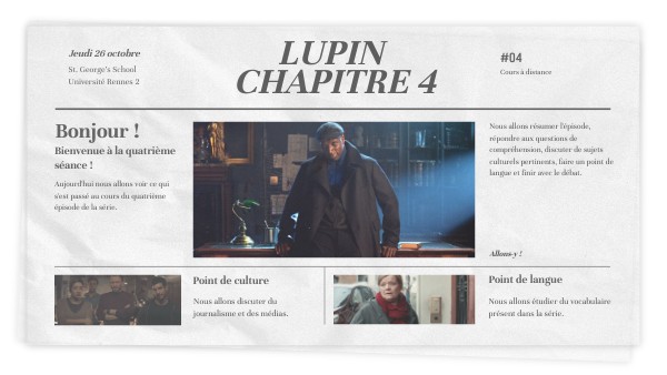 Nous allons résumer l'épisode, répondre aux questions de compréhension, faire un point de langue, discuter de sujets culturels pertinents et finir avec le débat.