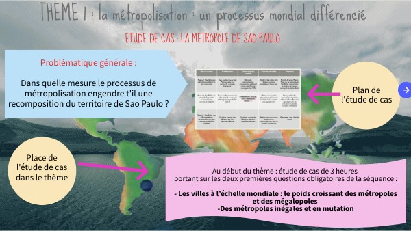 Au début du thème : étude de cas de 3 heures portant sur les deux premières questions obligatoires de la séquence : - Les villes à l’échelle mondiale : le poids croissant des métropoles et des mégalopoles -Des métropoles inégales et en mutation