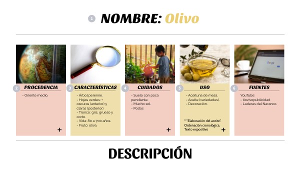 - Árbol perenne.- Hojas verdes: + oscuras (anterior) y claras (posterior).- Tronco: gris, grueso y corto. - Vida: 80 a 700 años. - Fruto: oliva.