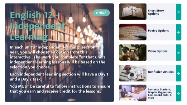 In each unit's "independent learning" section this year, you will choose an option from this interactive. The work you complete for that unit's independent learning lessons will be based on the selection you choose. Each independent learning section will have a Day 1 and a Day 2 task. You MUST be careful to follow instructions to ensure that you earn and receive credit for the lessons.