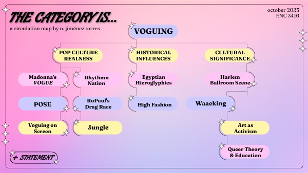 The goal of this circulation map is to track voguing from its historical origins through its exigence in pop culture and how it has influenced contemporary choreography, artistic political activism, and mainstream queer culture.
