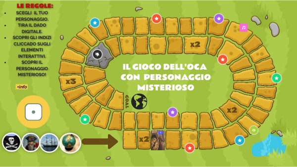 • Sono ammessi 4 giocatori per manche. • Ogni giocatore deve scegliere una pedina e lanciare i dadi (basta cliccare sul dado digitale). • Il giocatore che ottiene il numero più alto sarà quello che inizierà il gioco. • Per giocare, ogni partecipante deve lanciare il dado e spostare la propria pedina nella casella corrispondente. • Alcuni quadrati sul tabellone hanno un significato speciale. • Se il giocatore si ferma su una casella SORPRESA, ottiene il diritto di fare ciò che gli viene chiesto. • Se si ferma su una casella X2 o X3, deve moltiplicare il numero sul dado per il numero corrispondente e avanzare di quel numero di caselle. • Se finisce nella casella PERICOLO, il giocatore non potrà lanciare nuovamente i dadi finché un altro giocatore non avrà attraversato quella casella. • Il vincitore è colui che raggiunge per primo l’ultima casella e indovina il personaggio misterioso che si cela dietro tutti gli indizi. Buon divertimento!!!