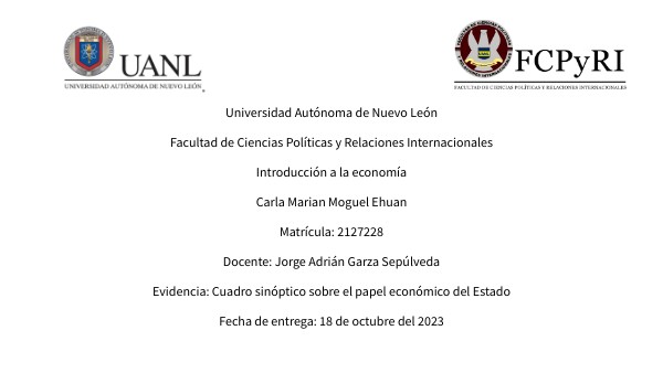Universidad Autónoma de Nuevo León Facultad de Ciencias Políticas y Relaciones Internacionales Introducción a la economía Carla Marian Moguel Ehuan Matrícula: 2127228 Docente: Jorge Adrián Garza Sepúlveda Evidencia: Cuadro sinóptico sobre el papel económico del Estado Fecha de entrega: 18 de octubre del 2023