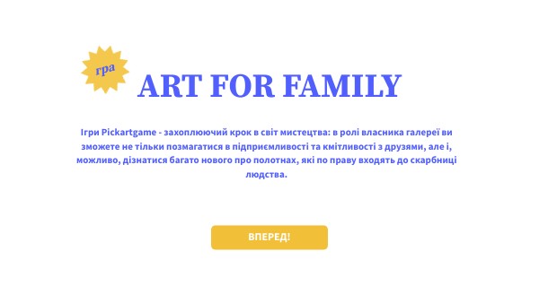 Ігри Art for family - захоплюючий крок в світ мистецтва: в ролі власника галереї ви зможете не тільки позмагатися в підприємливості та кмітливості з друзями, але і, можливо, дізнатися багато нового про полотнах, які по праву входять до скарбниці людства.