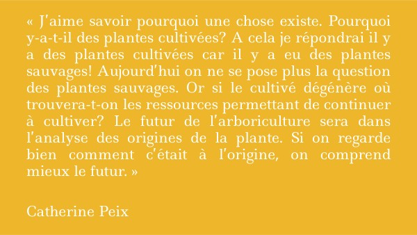 « J’aime savoir pourquoi une chose existe. Pourquoi y-a-t-il des plantes cultivées? A cela je répondrai il y a des plantes cultivées car il y a eu des plantes sauvages! Aujourd’hui on ne se pose plus la question des plantes sauvages. Or si le cultivé dégénère où trouvera-t-on les ressources permettant de continuer à cultiver? Le futur de l’arboriculture sera dans l’analyse des origines de la plante. Si on regarde bien comment c’était à l’origine, on comprend mieux le futur. » Catherine Peix