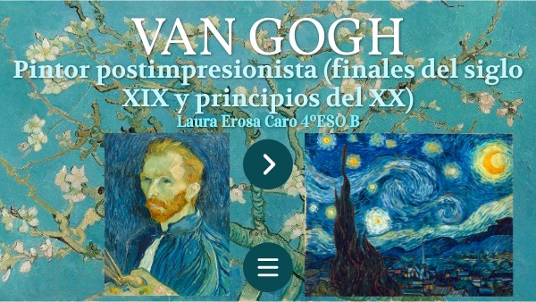 - Año: 1889 - Autor: Van Gogh - Ubicación: J. Paul Getty Museum, Los Ángeles, California (Estados Unidos) - Estilo: Postimpresionista - Temática: Llamó a la pintura "el pararrayos para mi enfermedad" porque sentía que podía evitar volverse loco al seguir pintando.