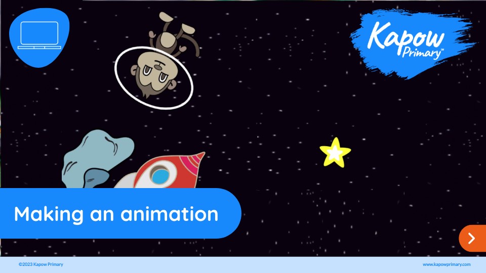 Remix suggestions: When a rock hits the monkey, he says, "Ow!" The rock could 'bounce' off the monkey. The Earth could spin. The star could become a shooting star. A flying saucer could appear. Choose three ideas and include them in your remix version.