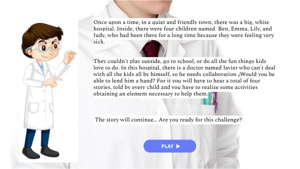 Once upon a time, in a quiet and friendly town, there was a big, white hospital. Inside, there were four children named Ben, Emma, Lily, and Judy, who had been there for a long time because they were feeling very sick. They couldn't play outside, go to school, or do all the fun things kids love to do. In this hospital, there is a doctor named Javier who can't deal with all the kids all by himself, so he needs collaboration ¿Would you be able to lend him a hand? For it you will have to hear a total of four stories, told by every child and you have to realize some activities obtaining an element necessary to help them. The story will continue… Are you ready for this challenge?