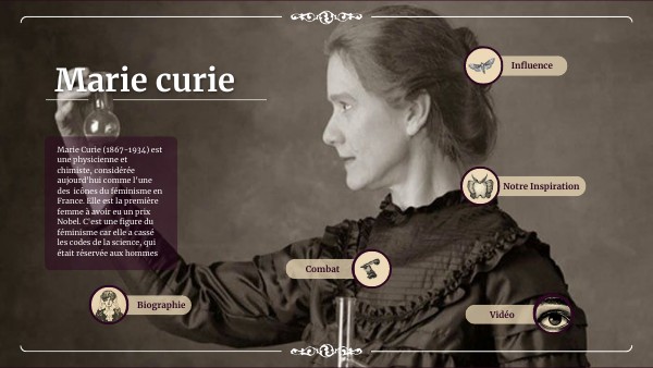 Marie Curie (1867-1934) est une physicienne et chimiste, considérée aujourd'hui comme l'une des icônes du féminisme en France. Elle est la première femme à avoir eu un prix Nobel. C'est une figure du féminisme car elle a cassé les codes de la science, qui était réservée aux hommes