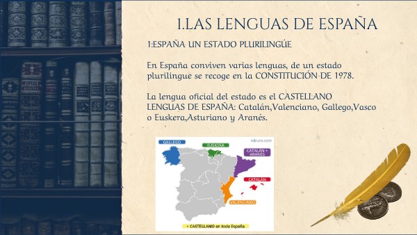 1:ESPAÑA UN ESTADO PLURILINGÚE En España conviven varias lenguas, de un estado plurilingue se recoge en la CONSTITUCIÓN DE 1978. La lengua oficial del estado es el CASTELLANO LENGUAS DE ESPAÑA: Catalán,Valenciano, Gallego,Vasco o Euskera,Asturiano y Aranés.