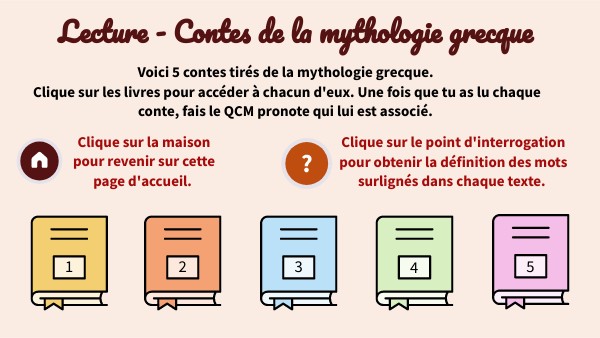 Voici 5 contes tirés de la mythologie grecque. Clique sur les livres pour accéder à chacun d'eux. Une fois que tu as lu chaque conte, fais le QCM pronote qui lui est associé.