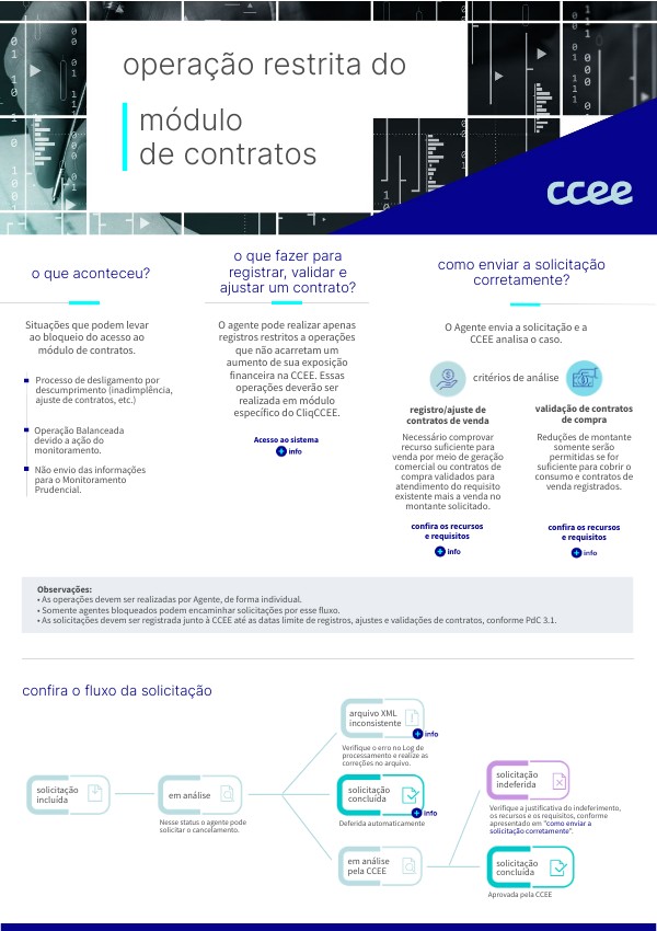 Observações: • As operações devem ser realizadas por Agente, de forma individual. • Somente agentes bloqueados podem encaminhar solicitações por esse fluxo. • As solicitações devem ser registrada junto à CCEE até as datas limite de registros, ajustes e validações de contratos, conforme PdC 3.1.