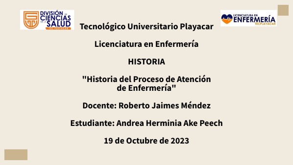 Tecnológico Universitario Playacar Licenciatura en Enfermería HISTORIA "Historia del Proceso de Atención de Enfermería" Docente: Roberto Jaimes Méndez Estudiante: Andrea Herminia Ake Peech 19 de Octubre de 2023