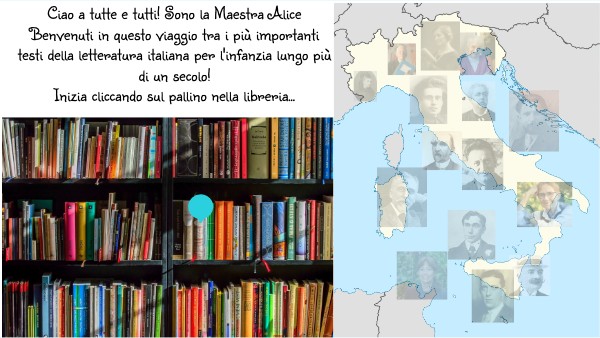 Ciao a tutte e tutti! Sono la Maestra Alice Benvenuti in questo viaggio tra i più importanti testi della letteratura italiana per l'infanzia lungo più di un secolo! Inizia cliccando sul pallino nella libreria...