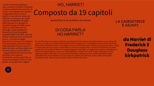 ho, harriet! parla di una storia realmente accaduta di harriet tubman che praticamente era una schiava di colore scuro nata in una fattoria del Meryland era la terzagenita di una famiglia numerosissima (araminta detta minty )diventera'harriet solo inseguito alla conoscenza dei padroni bianchi e per quanto erano crudeli e la fatica del lavoro nei campi e nella fattoria e le furono assegnati dei conmpiti non piacevoli anzi molto sgradevoli come quello di liberare le trappole dai grossi topi ragno e a bagno tutto il giorno nella palude, è minty è ammalata spesso e cresce con molta difficolta' a tredici anni un all' emporio del paese, senza ragione la colpisce alla testa con un pesante bilancierere( attenzione frase molto importante negra scansafatiche ) viene chiamata così e poi il peso la colpisce all' improviso minty cadde a terra quasi perdendo la vita, stesse male per giorni anche rischiando di morire.