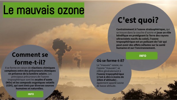 Le "mauvais" ozone, ou l'ozone "mauvais", se réfère généralement à l'ozone troposphérique (c'est-à-dire à moins de 10km d'altitude) , également appelé ozone de basse altitude.