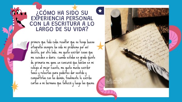primero que todo cabe resaltar que no tengo buena ortografía siempre ha sido mi problema por así decirlo; por otro lado, me gusta escribir cosas que me suceden a diario. cuando estaba en grado quinto de primaria me gane un concursó que hacían en mi colegio al mejor cuento; me gusta mucho escribir fases y releerlas para poderles dar sentido y compartirlas con los demás; finalmente le escribo cartas a mi hermano que falleció y luego las quemo.